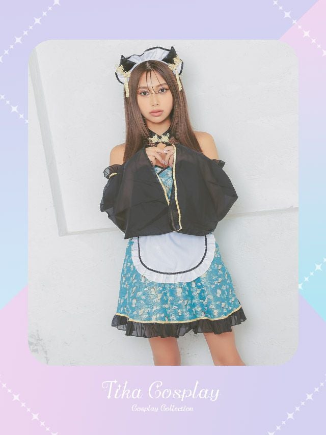 5. [SALE] コスプレ 鬼 和装 メイド 付け袖あり谷間セクシーフレアスカート個性アニマル [4点セット] (カチューシャ/ワンピース/付け袖/帯ベルト)