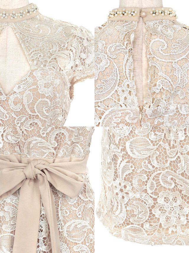 ウエストリボン付き半袖ハイネックビジューバストカットアウトケミカルレース膝丈タイトドレスの商品詳細1