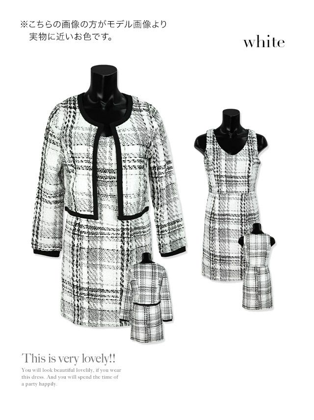 大人可愛いチェック柄のセットアップスーツ♪ モノトーンチェック柄ノーカラーツイードジャケットワンピーススーツ (Sサイズ~XLサイズ) (天使かれん/キャバスーツ着用)