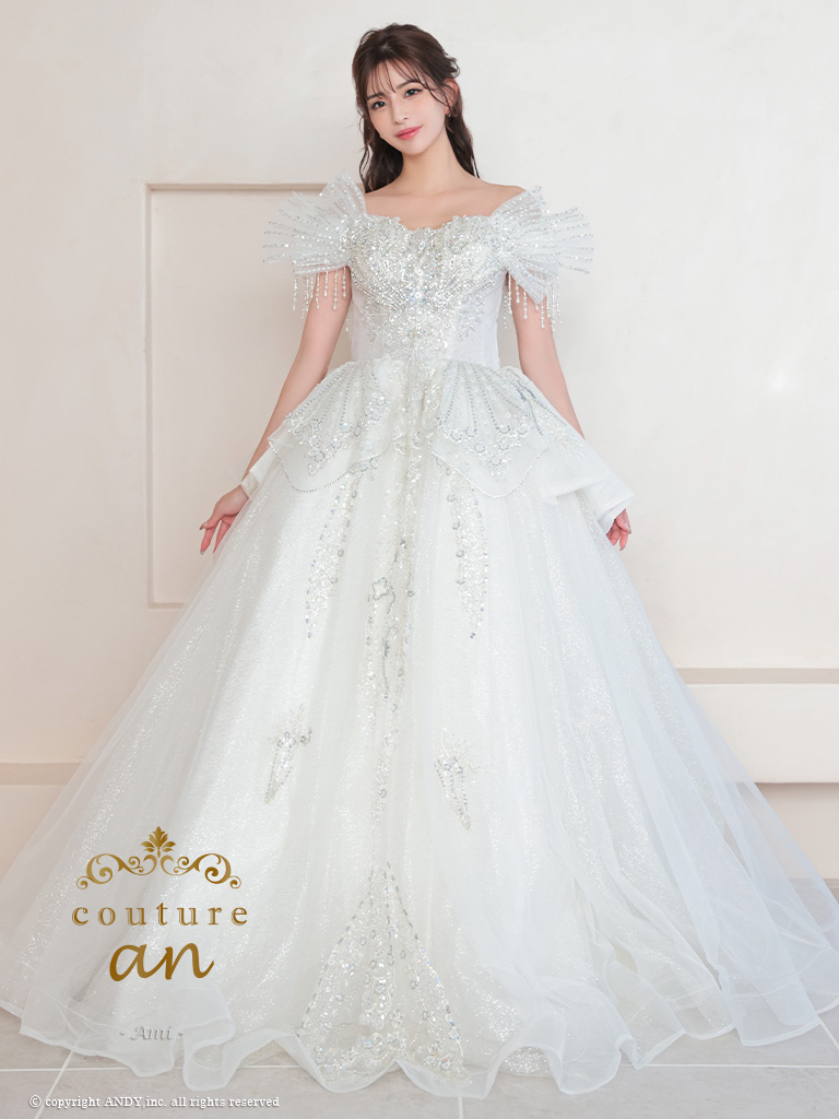 ボリュームたっぷりの華やかなロングドレス☆ [couture an/クチュールアン] 高級 バースデー オフショルダー ビジュー 刺繍 レース ボリューム フリル Aラインロングドレス