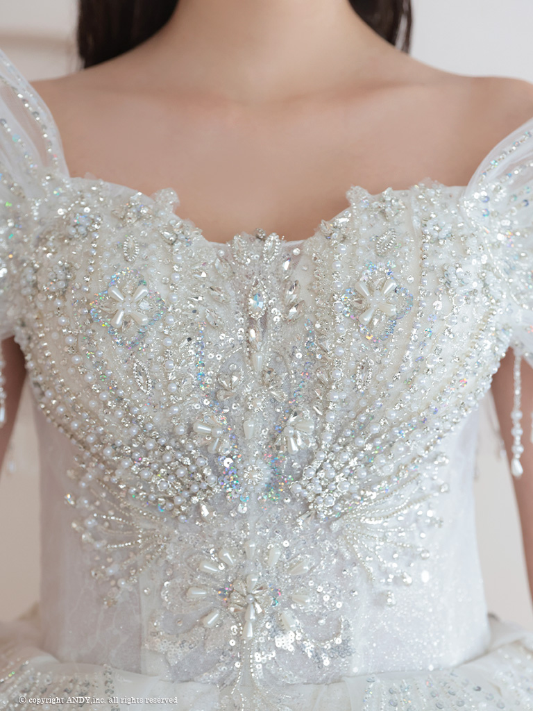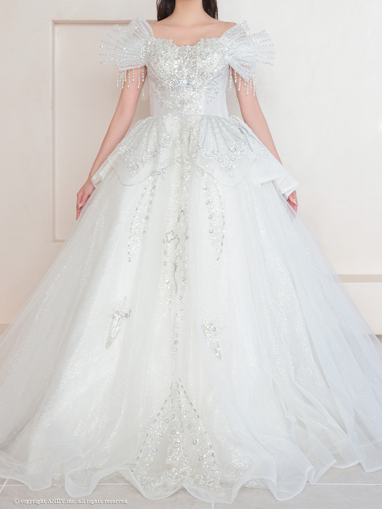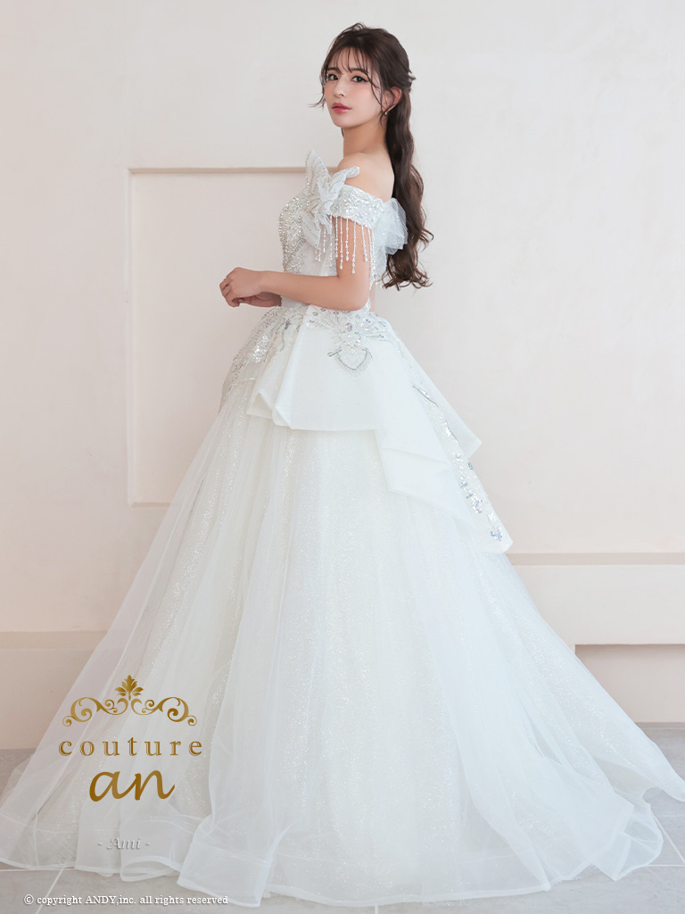 4. [couture an/クチュールアン] 高級 バースデー オフショルダー ビジュー 刺繍 レース ボリューム フリル Aラインロングドレス