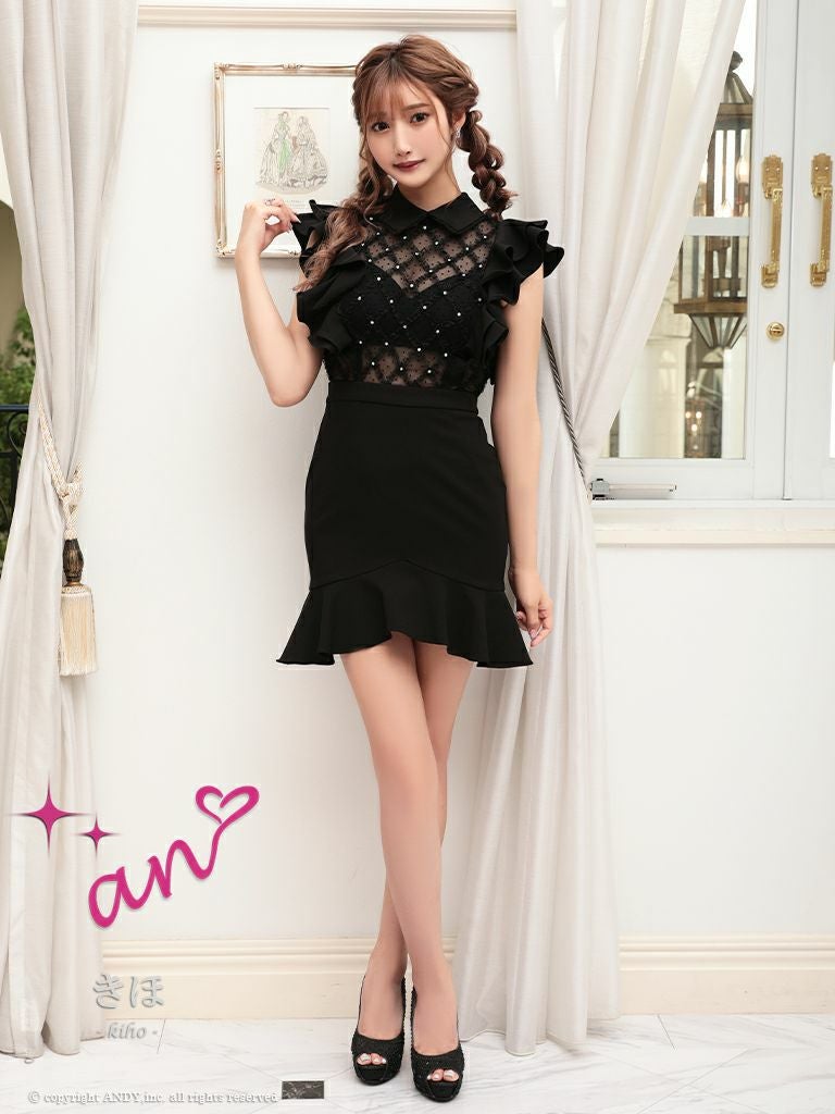 キャバドレス ミニドレス [an/アン] 高級襟付きデコルテシースルービジューウエスト切替フリルノースリーブタイトミニドレス