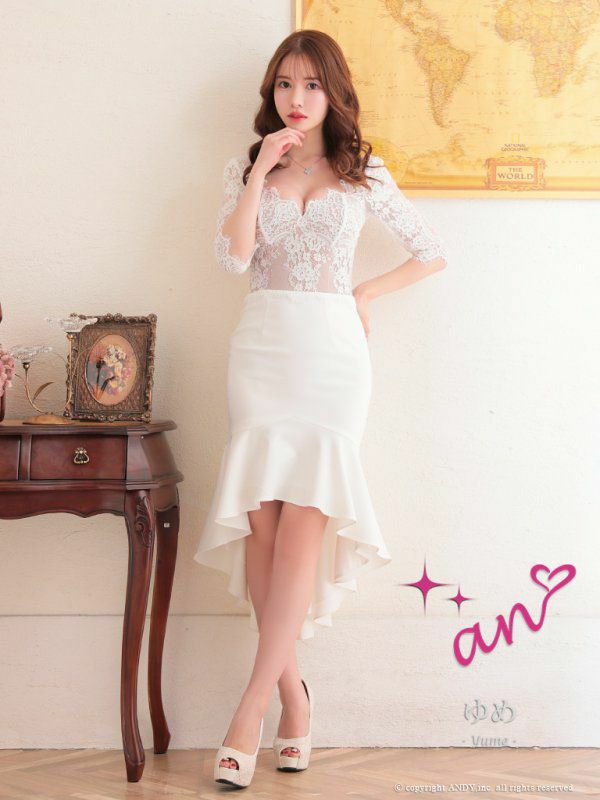 4. [an/アン] 高級 袖あり フラワーレース切替 マーメイド ロングテール 膝丈ドレス