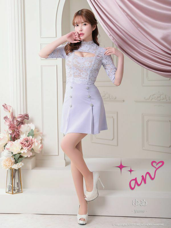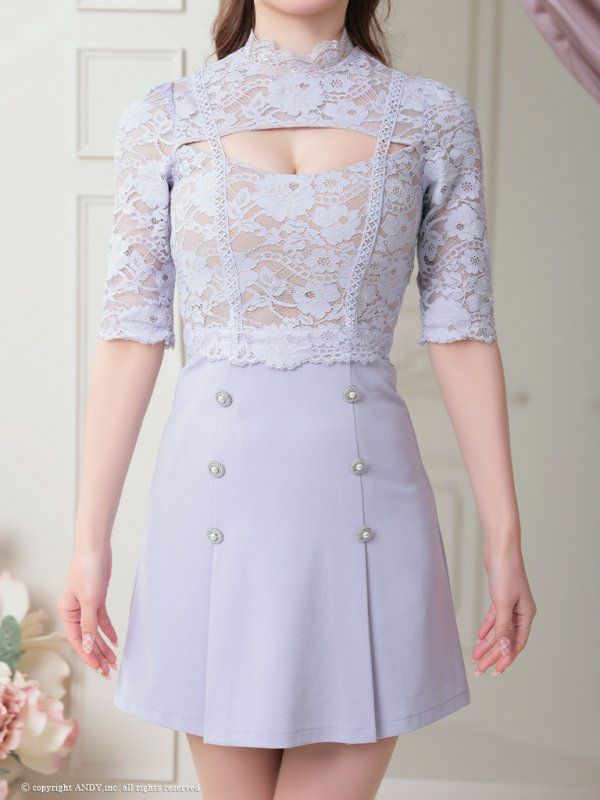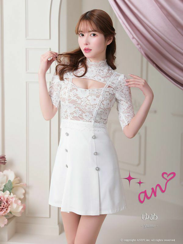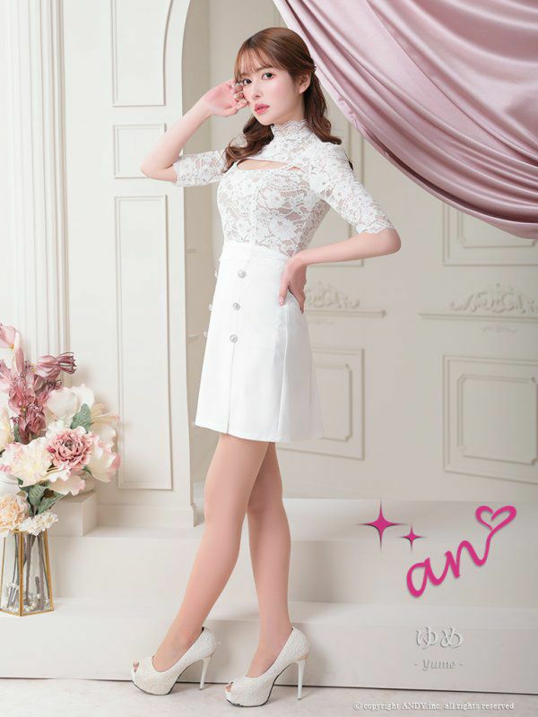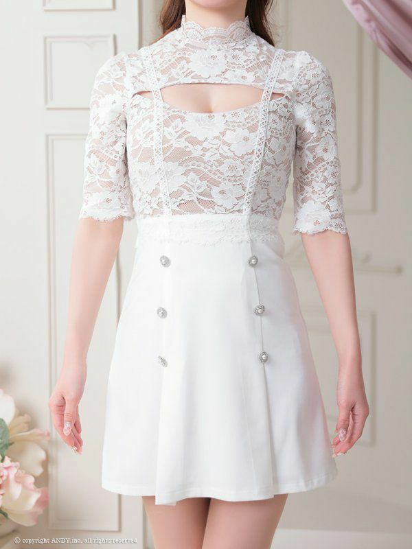 4. [an/アン] 高級 袖あり ハイネック バストカット フラワー刺繍レース ダブルボタン プリーツ 谷間魅せ フレアミニドレス