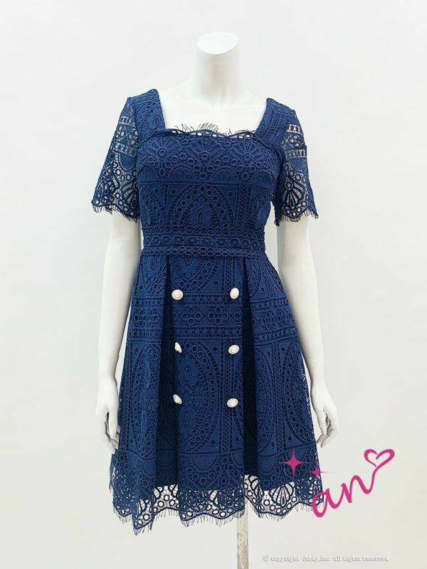 5. [an/アン] 高級ワンカラースカラップレースフロントダブルボタン半袖フレアミニドレス