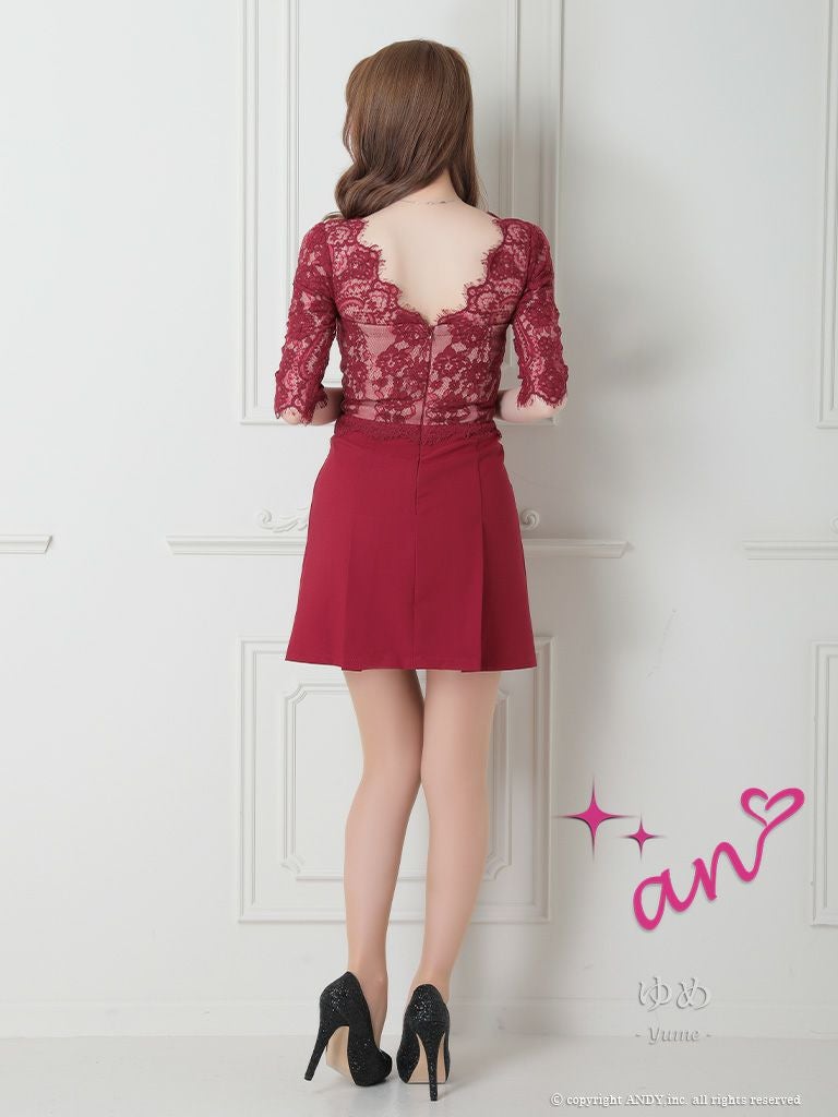 6. [an/アン] 高級袖ありヌーディーカラーレースウエスト切り替えダブルゴールドボタンボックスフレアミニドレス
