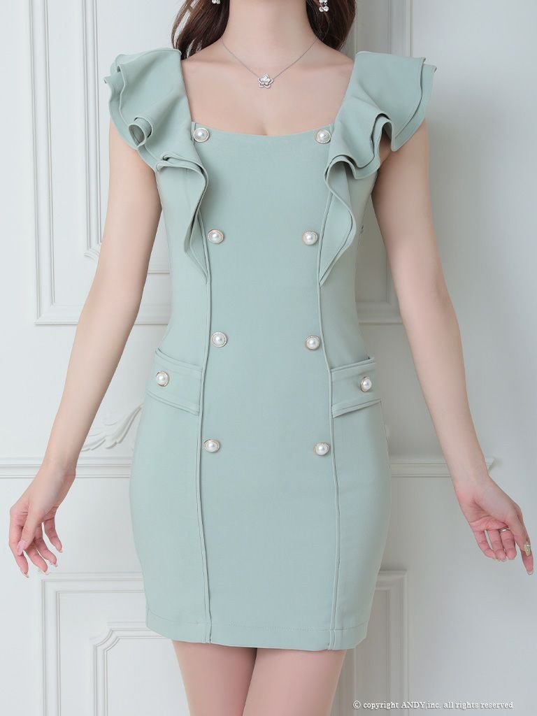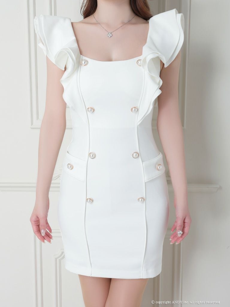 5. [an/アン] 高級パールボタンワンカラーショルダーフリルノースリーブタイトミニドレス