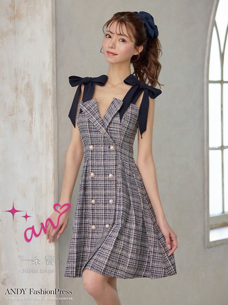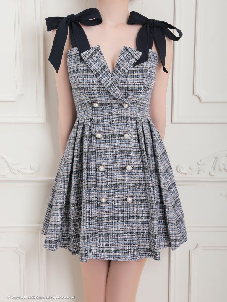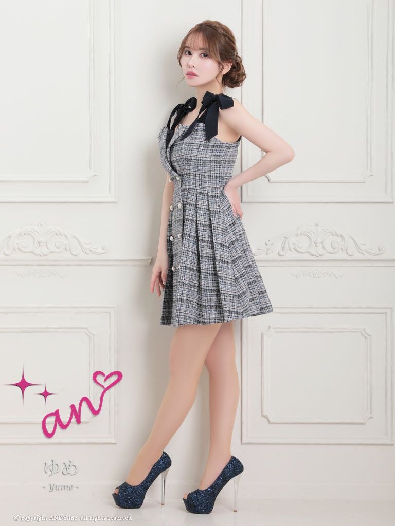 キャバドレス Andy アンディ 高級ツイードショルダーリボン付きノースリーブフレアミニドレス