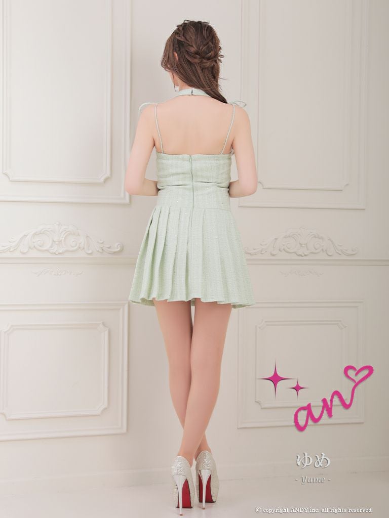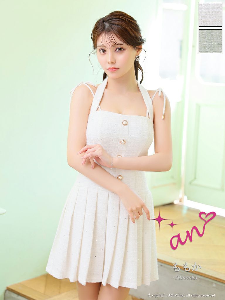 キャバドレス an アン 高級ツイードキャミソールリボンフロントパールボタンプリーツフレアミニドレス