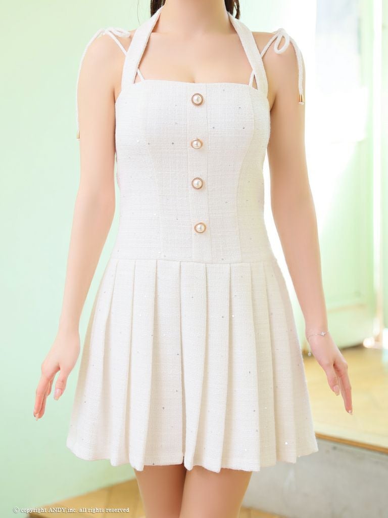 5. [an/アン] 高級ツイードキャミソールリボンフロントパールボタンプリーツフレアミニドレス
