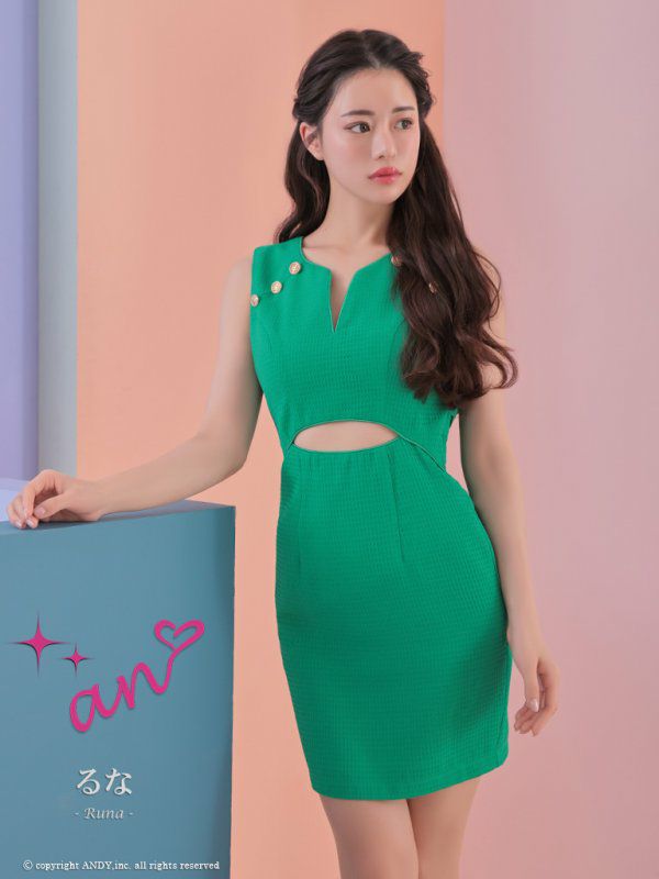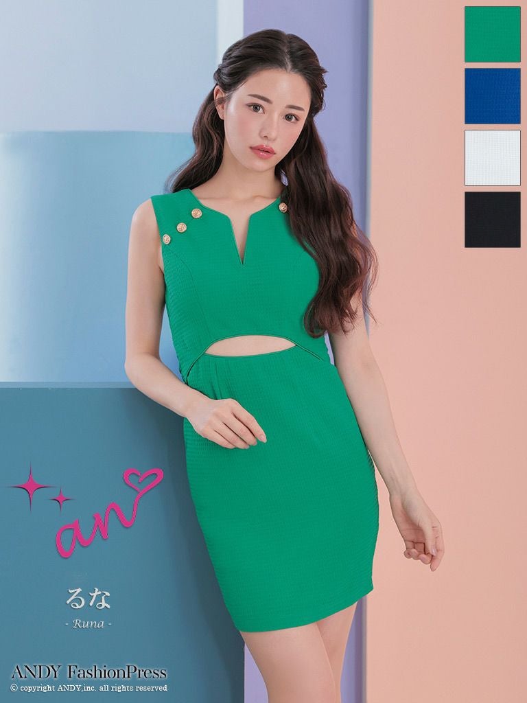 トレンドのカットアウトデザインで視線を独占☆ [an/アン] 高級ゴールボタン付きノースリーブウエスト&バックカットリボンワンカラータイトミニドレス
