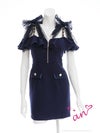 5. [an/アン] 高級肩出し 二の腕カバー ジップ ツイード ボタン ショルダー リボン チェーン タイトミニドレス