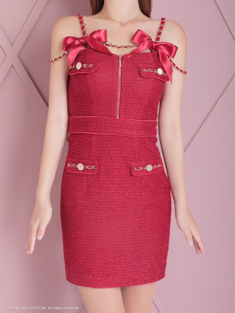 ワンカラーで可愛い☆ [an/アン] 高級キャミソール ジップ チェーンボタン リボン タイトミニドレス