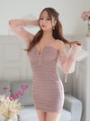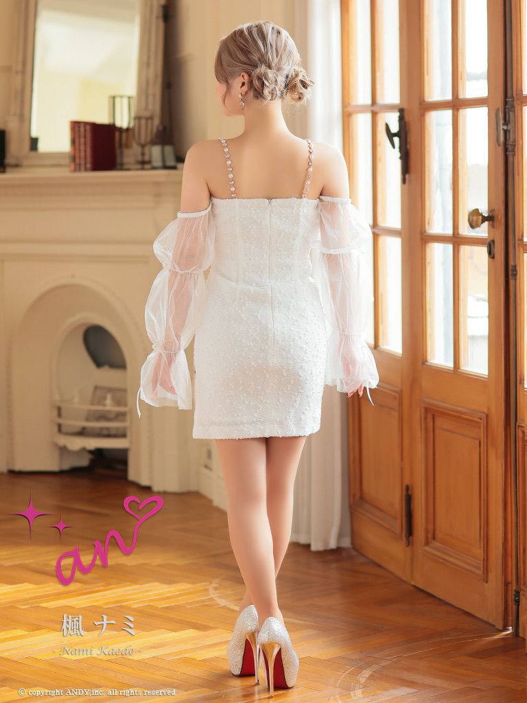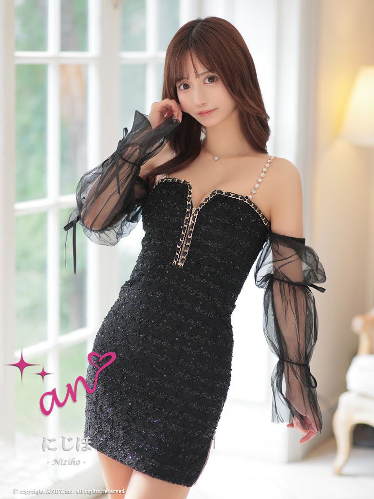 キャバドレス an アン  高級肩あきジップツイード長袖シフォンスリーブリボンパールタイトミニドレス