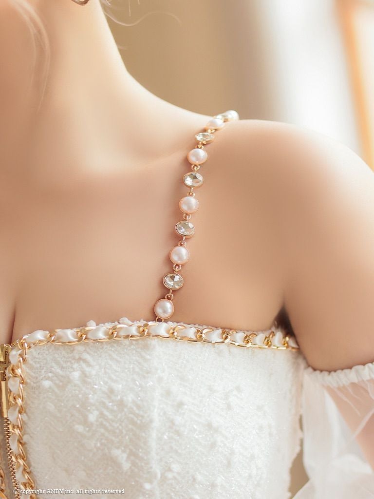 5. [an/アン] 高級肩出し 二の腕カバー ジップ ツイード 長袖 袖あり シフォンスリーブ リボン パール タイトミニドレス