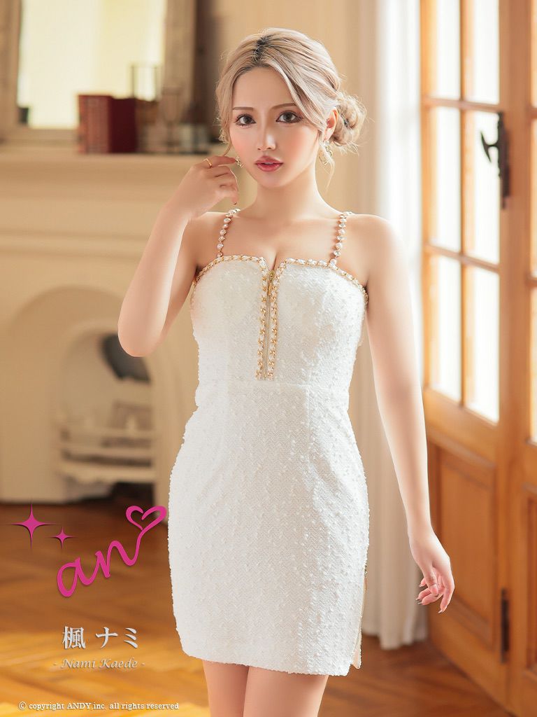 キャバドレス an アン  高級肩あきジップツイード長袖シフォンスリーブリボンパールタイトミニドレス