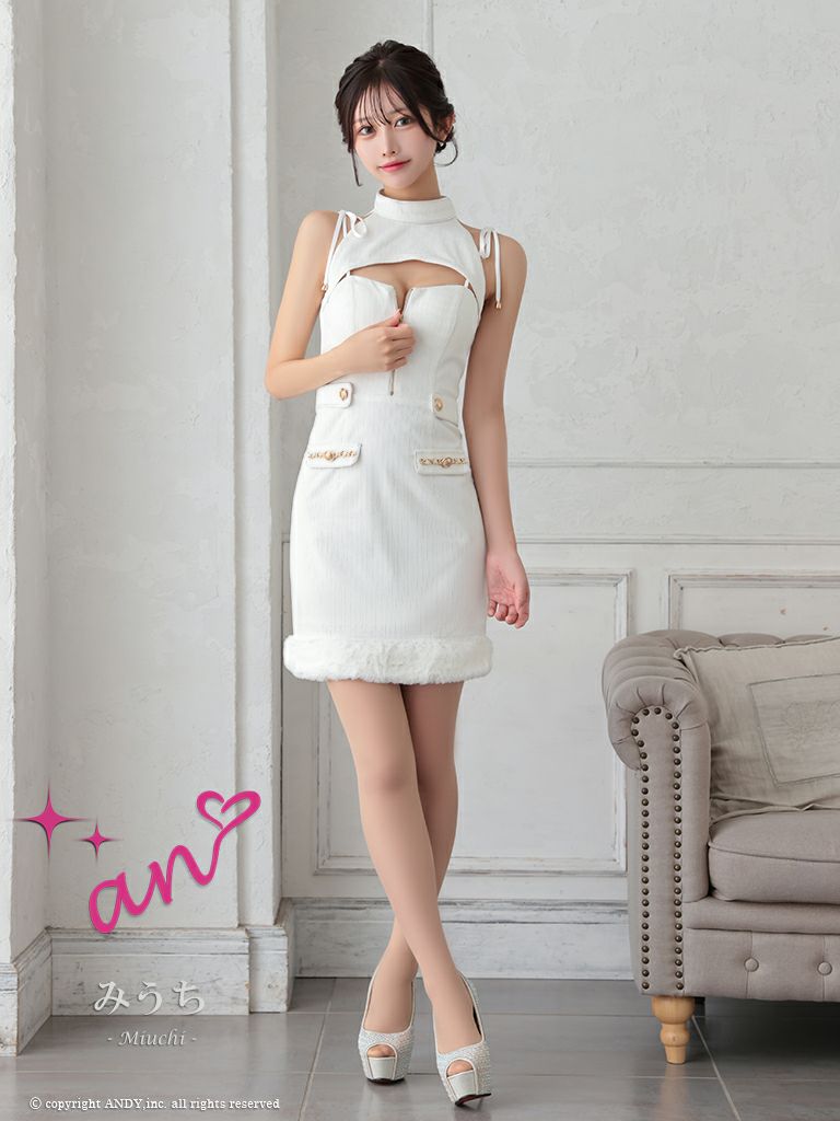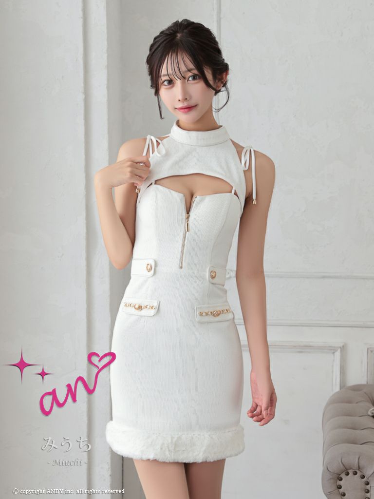 3. SALE [an/アン] 高級 ホルターネック ジップ バストカットボタン チェーン 裾ファー 谷間魅せ タイトミニドレス