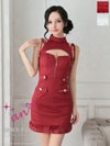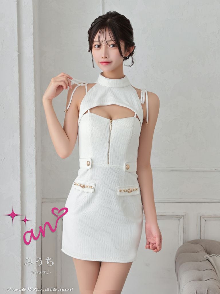 キャバドレス an アン 高級ホルターネックジップバストカットボタンチェーン裾ファータイトミニドレス