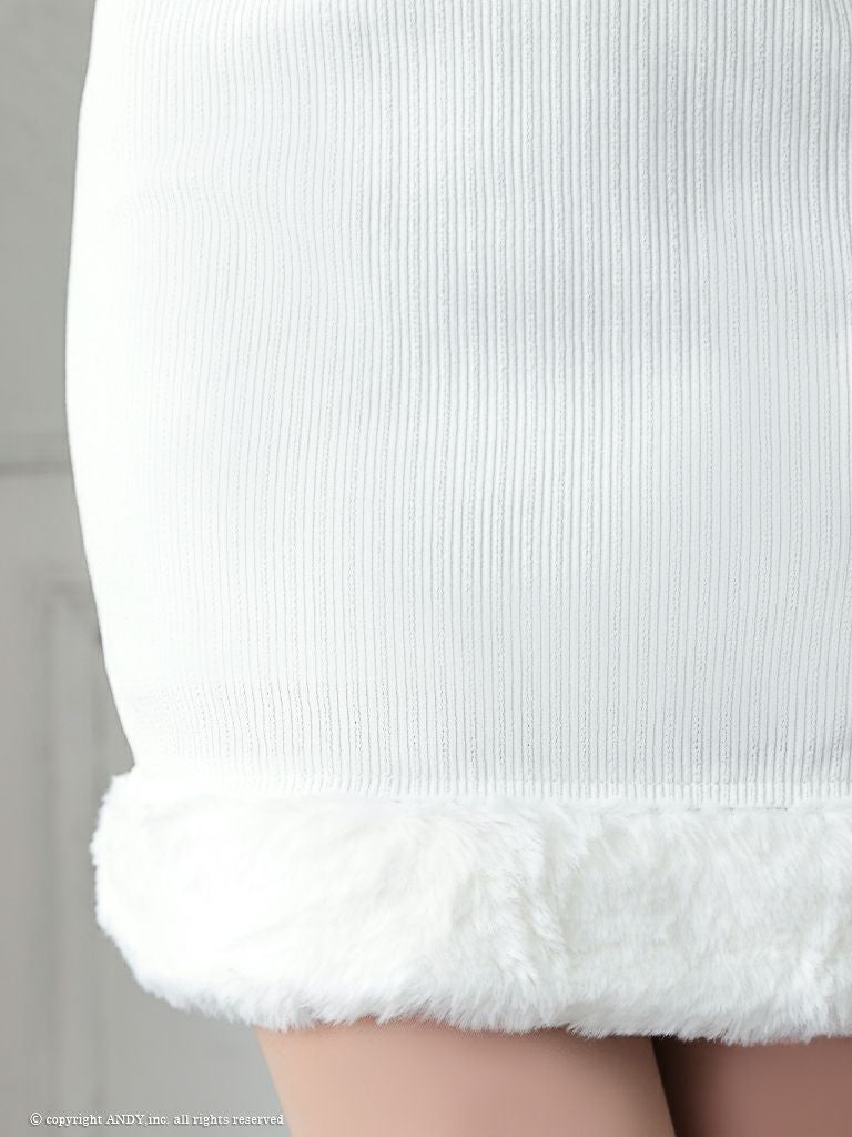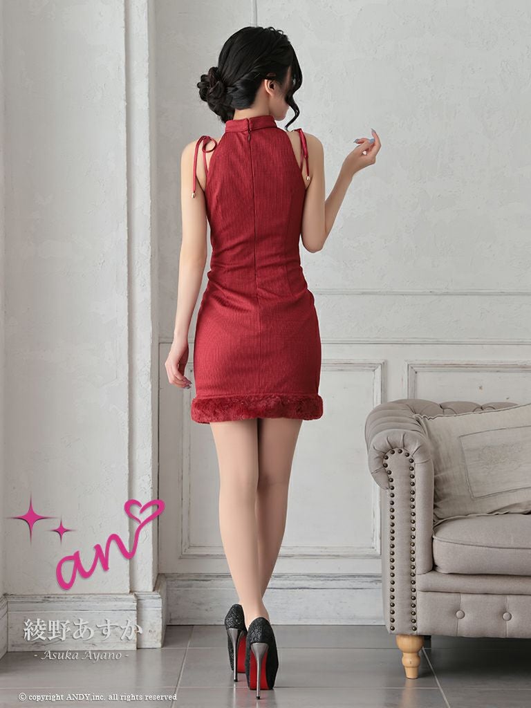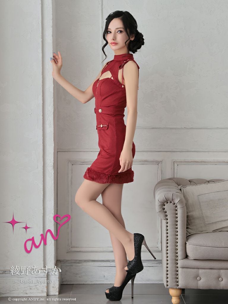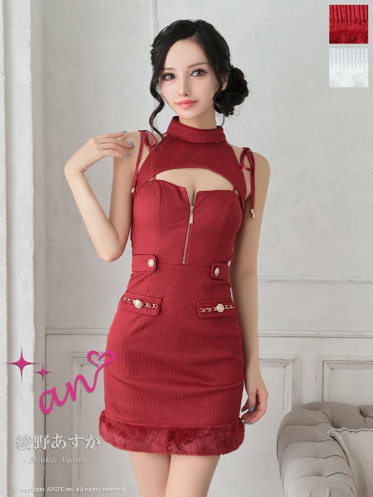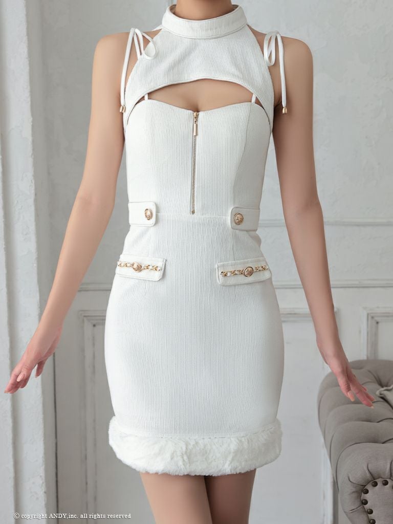 ワンカラーで高級感溢れる☆ SALE [an/アン] 高級 ホルターネック ジップ バストカットボタン チェーン 裾ファー 谷間魅せ タイトミニドレス