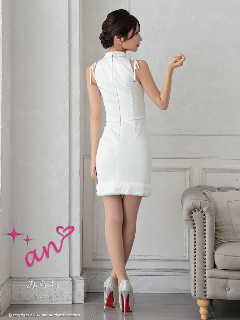 4. SALE [an/アン] 高級 ホルターネック ジップ バストカットボタン チェーン 裾ファー 谷間魅せ タイトミニドレス