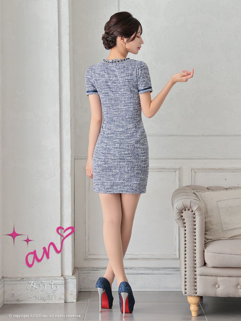 キャバドレス an アン 高級半袖ツイードジップゴールドチェーンリボンタイトミニドレス