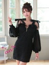 6. [an/アン] 高級肩出し 二の腕カバー 長袖 袖あり ジップ チェーン ショルダーリボン ファー付き タイトミニドレス
