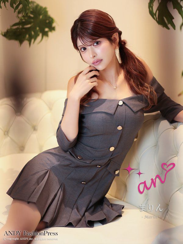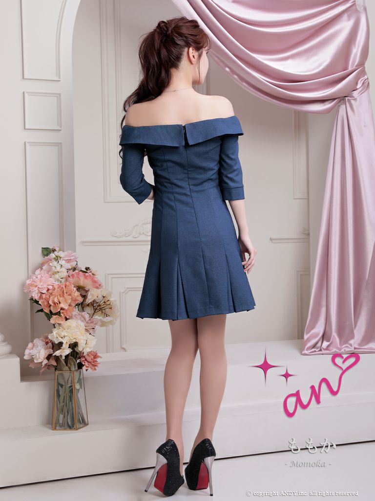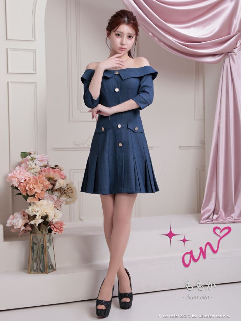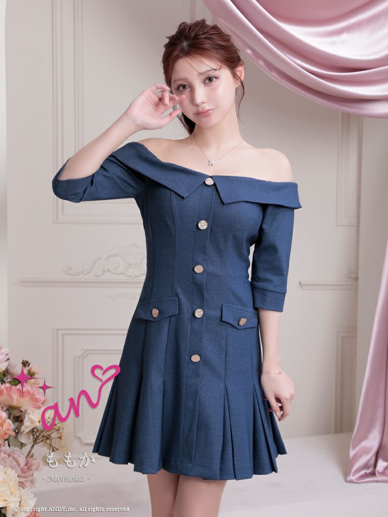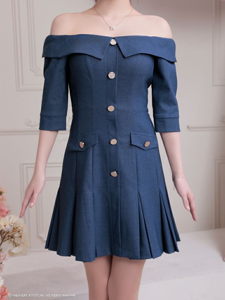 5. [an/アン] 高級袖ありオフショルダーゴールドボタンワンカラープリーツフレアミニドレス