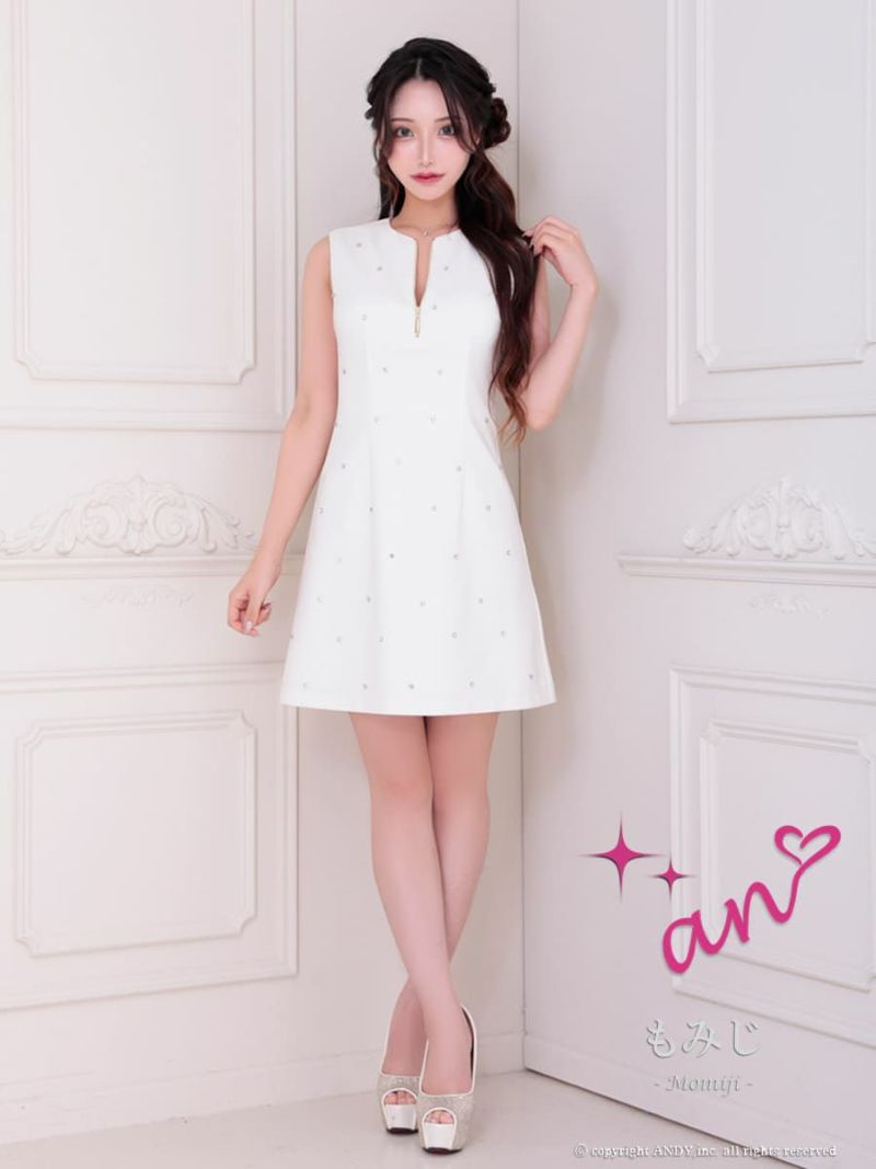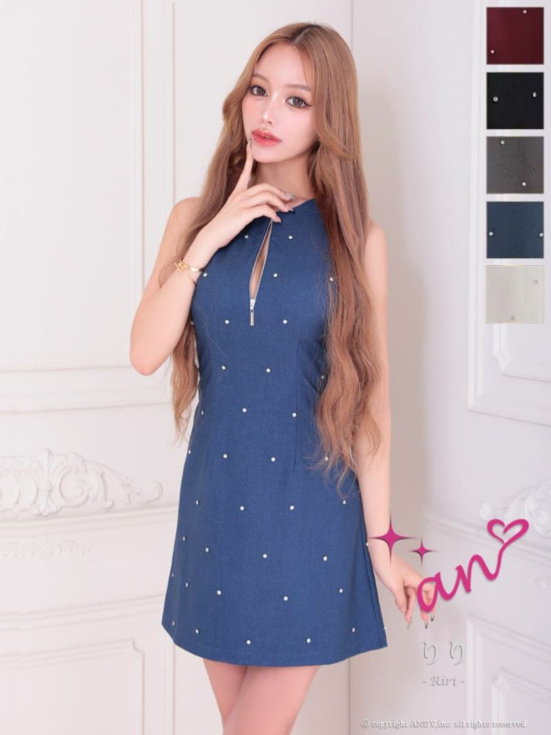 5. [an/アン] 高級 ノースリーブ ジップデザイン ビジュー 背中魅せ フレアミニドレス