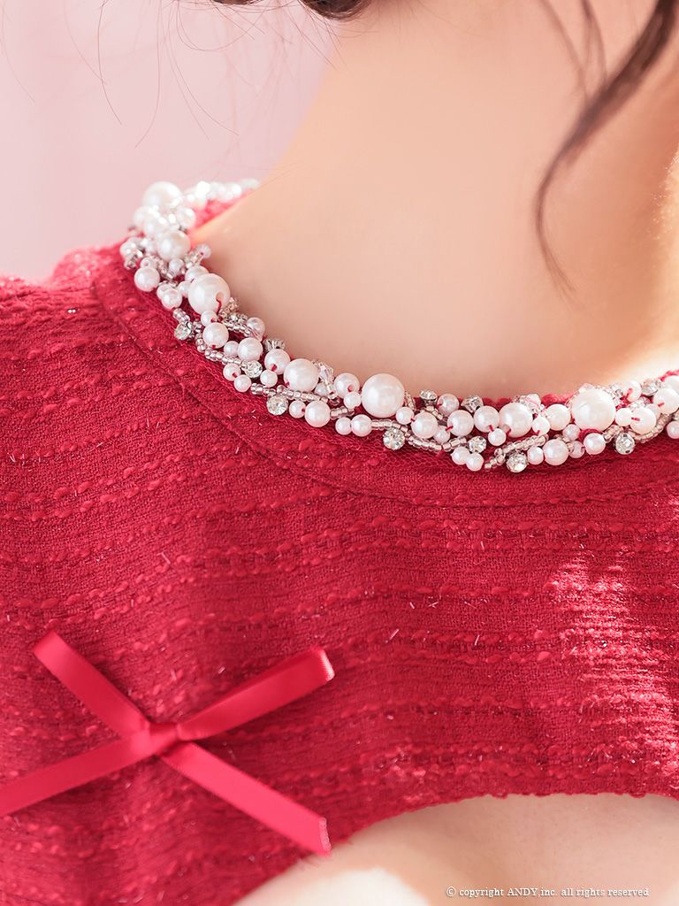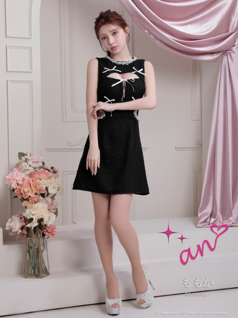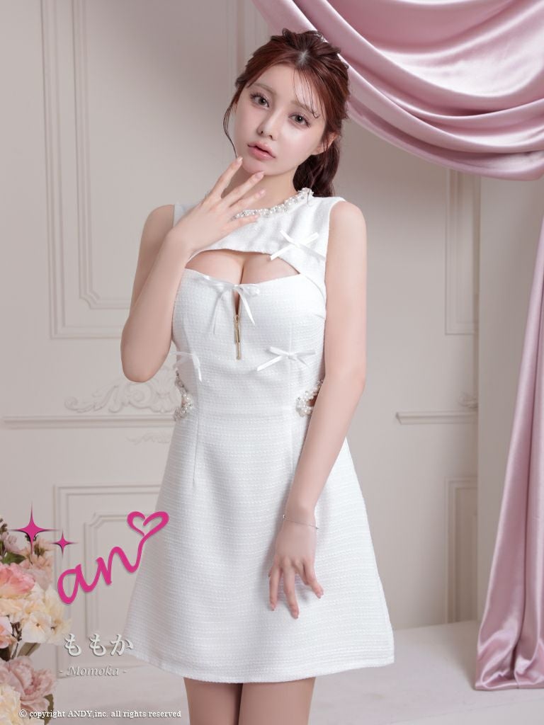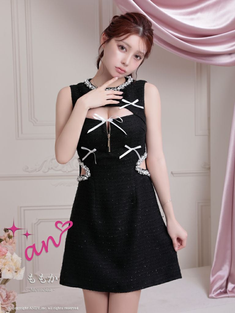 5. [an/アン] 高級 ノースリーブ バストカット ジップ リボン パール くびれ透け 谷間魅せ フレアミニドレス