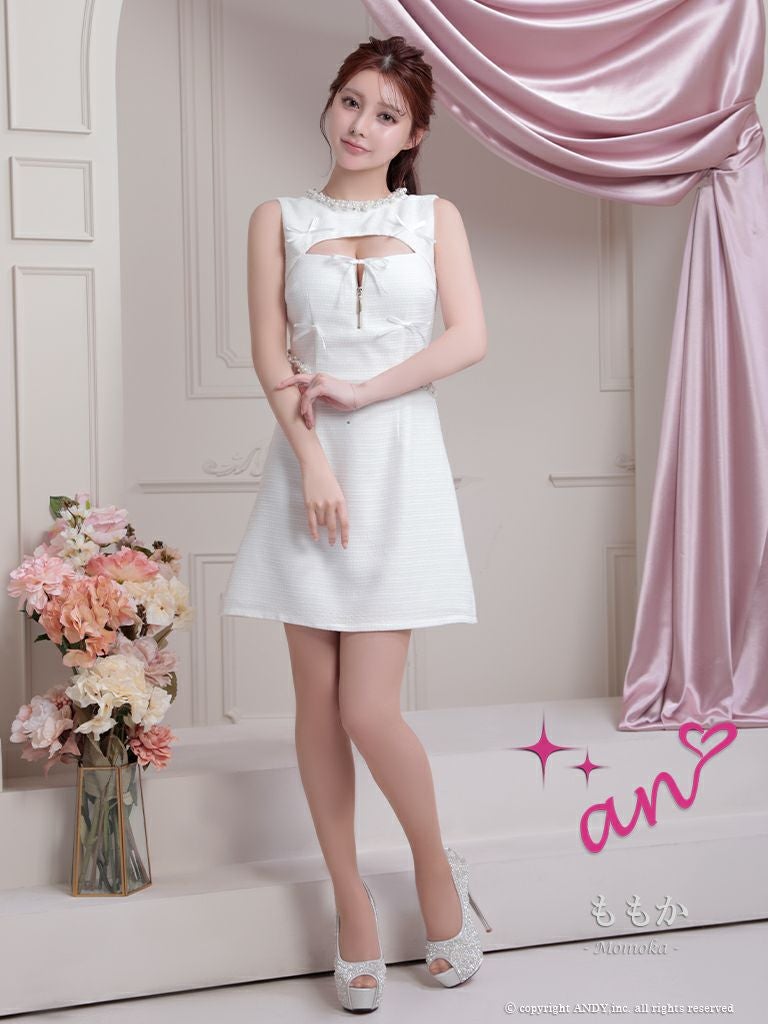 4. [an/アン] 高級 ノースリーブ バストカット ジップ リボン パール くびれ透け 谷間魅せ フレアミニドレス