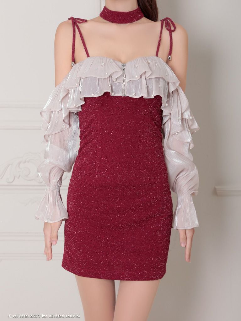 ラメが煌めくミニドレス☆ [an/アン] 高級2way肩出し 二の腕カバー長袖 袖ありパールラメチョーカー付きタイトミニドレス