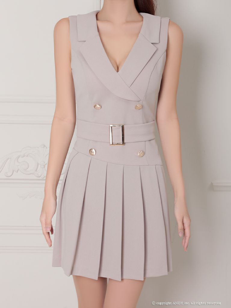 5. [an/アン] 高級 ノースリーブ 襟付き ウエストベルト ゴールドボタン フレアミニドレス