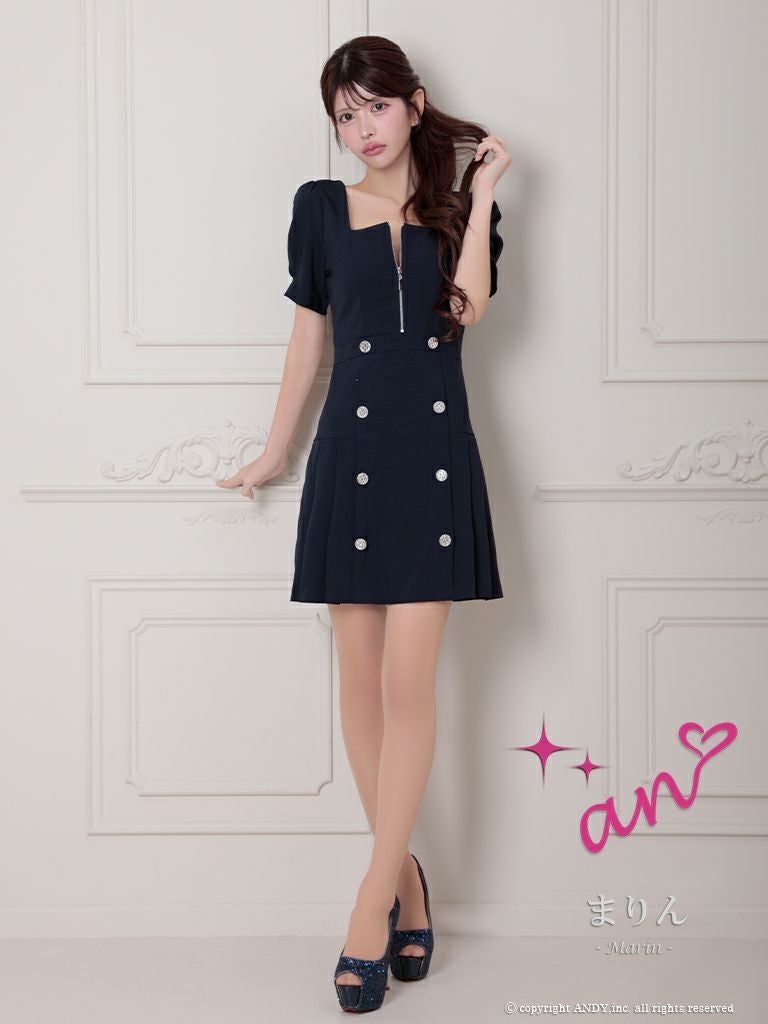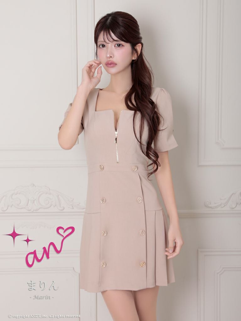 ジップ調節で谷間をチラ魅せ☆ [an/アン] 高級半袖 ジップ スクエアネック ボタン プリーツ フレアミニドレス