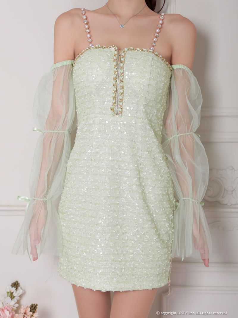 キャバドレス an アン 高級 キャミソール ジップデザイン ツイード パールチェーン 2way チュール 袖 リボン タイトミニドレス