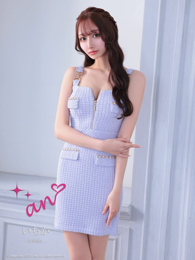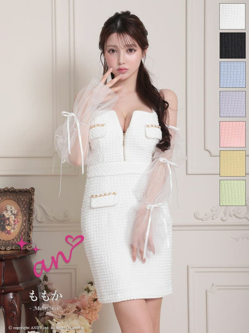 ゴールドのフックが大人っぽい★ [an/アン] 高級 ノースリーブ 長袖 リボン レース ポケット ジップデザイン 谷間魅せ タイトミニドレス