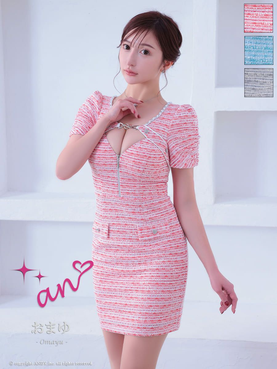 キャバドレス Andy アンディ 高級半袖ジップデザインツイードポケットバストカットタイトミニドレス