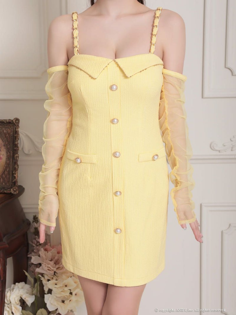 級キャミソール長袖 襟つき ツイード ボタン ポケット タイトミニドレス