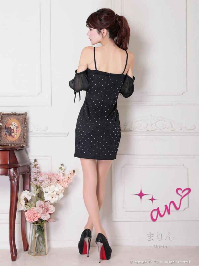 キャバドレス Andy アンディ 高級袖ありキャミソールジップドット柄レースリボンレース谷間見せミニドレス