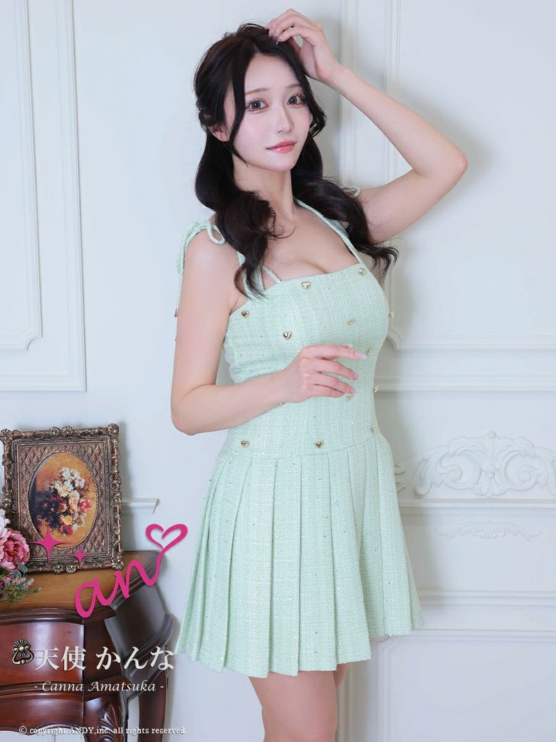 キャバドレス an アン 高級 ホルターネック ツイード ショルダーリボン スパンコール ビジュー ボタン プリーツ フレアミニドレス