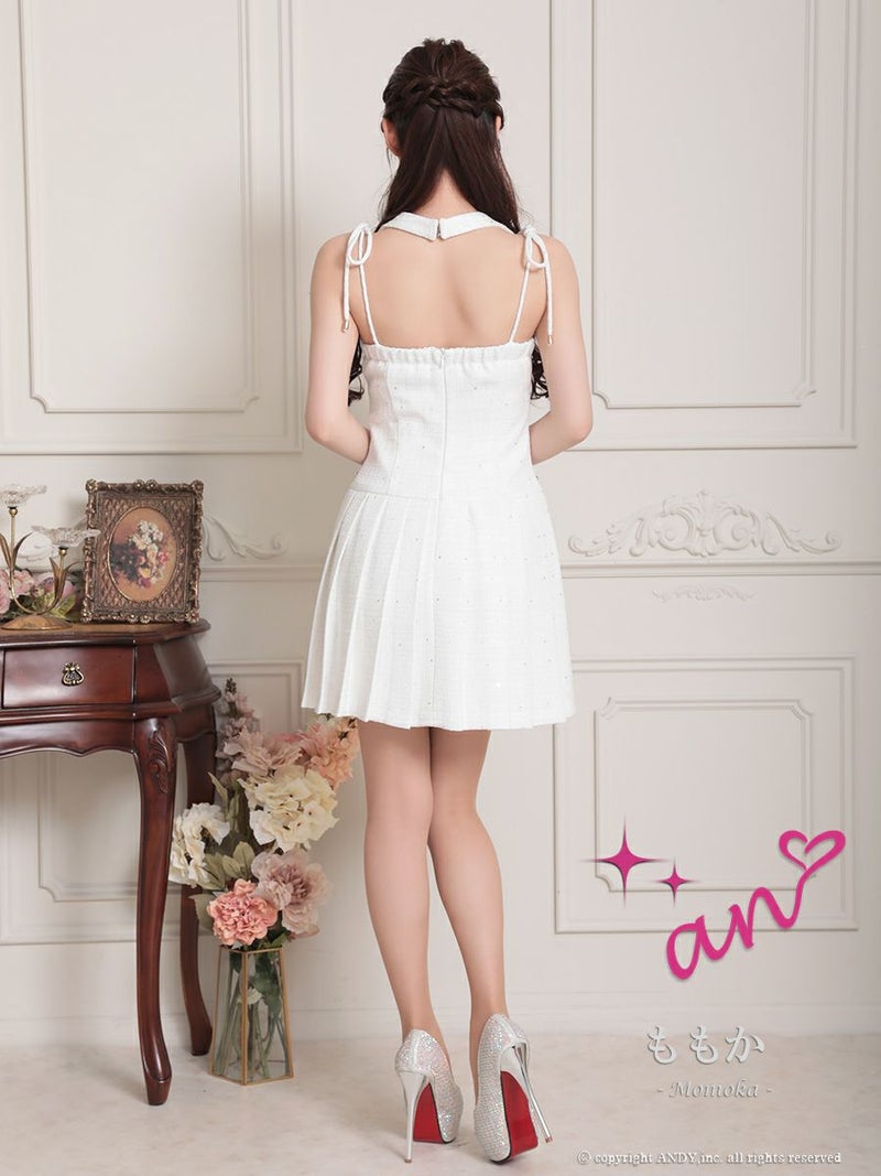5. [an/アン] 高級 ホルターネック ツイード ショルダーリボン スパンコール ビジュー ボタン プリーツ フレアミニドレス