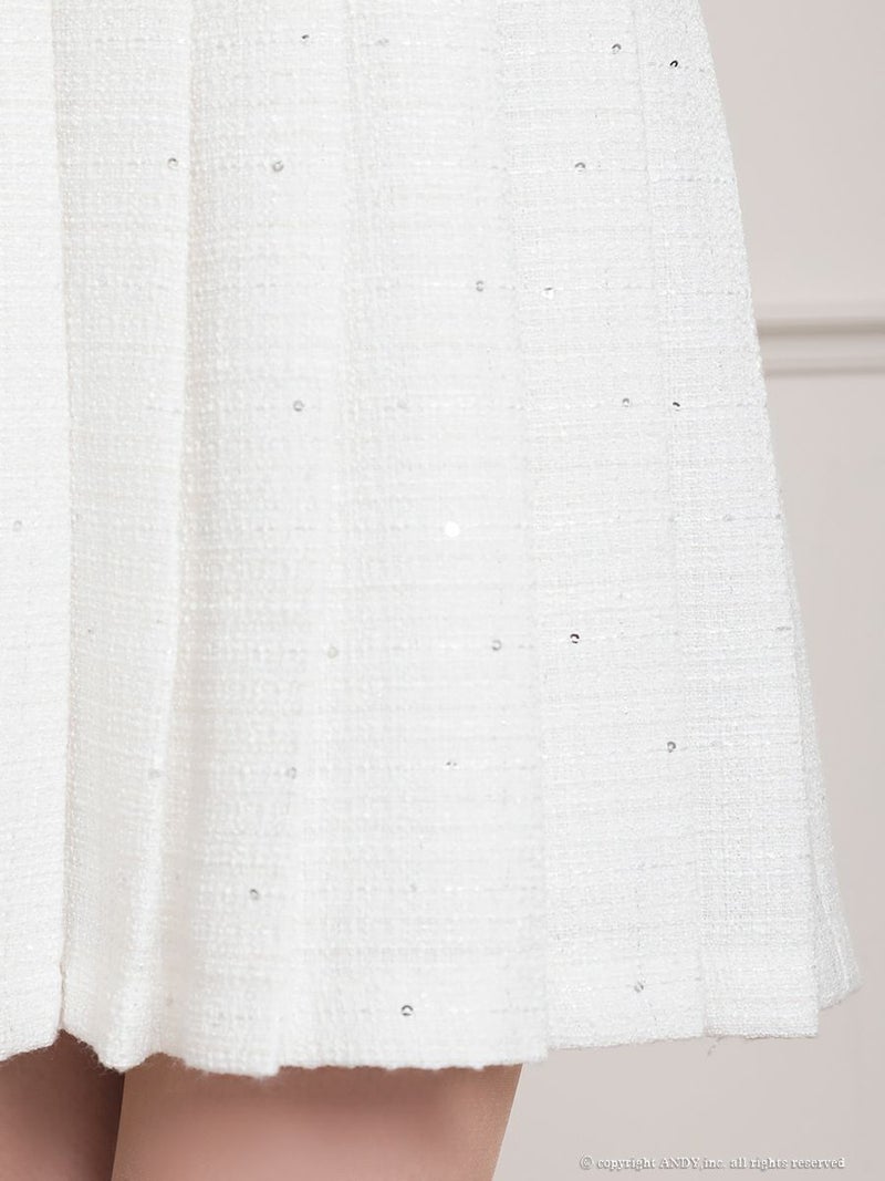 4. [an/アン] 高級 ホルターネック ツイード ショルダーリボン スパンコール ビジュー ボタン プリーツ フレアミニドレス