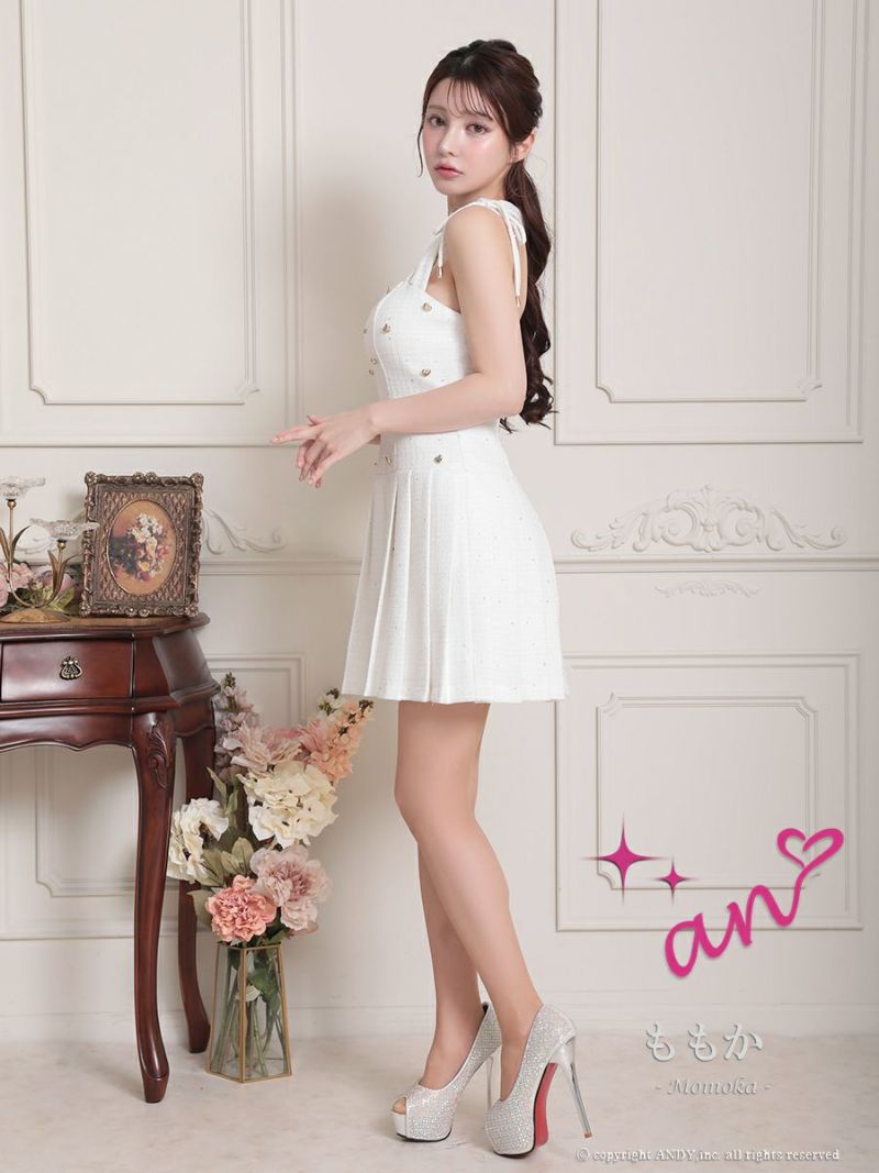 キャバドレス an アン 高級 ホルターネック ツイード ショルダーリボン スパンコール ビジュー ボタン プリーツ フレアミニドレス