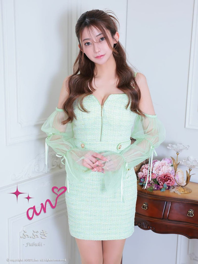 キャバドレス an アン 高級 ノースリーブ リボン ツイード ジップデザイン 谷間魅せ ポケット チュール袖 タイトミニドレス