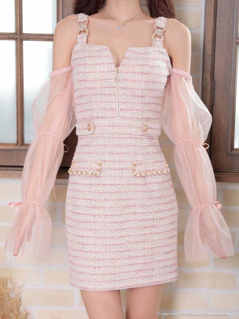 5. [an/アン] 高級 2way チュール袖付き ノースリーブ リボン ツイード ジップデザイン 谷間魅せ ポケット タイトミニドレス