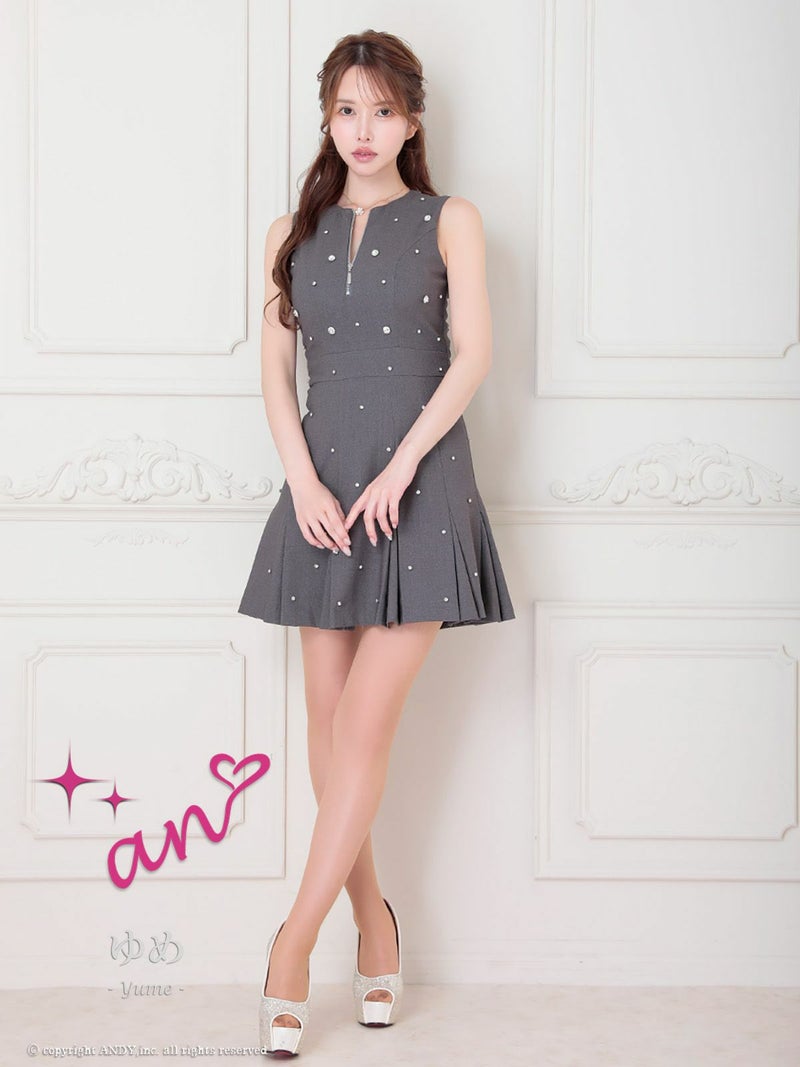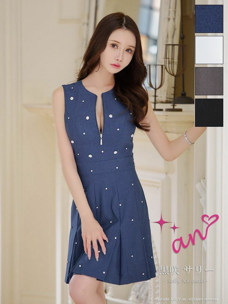 シンプルなデザインで大人可愛い♡ [an/アン] 高級 ノースリーブ ビジュー ジップ 背中魅せ プリーツ フレアミニドレス