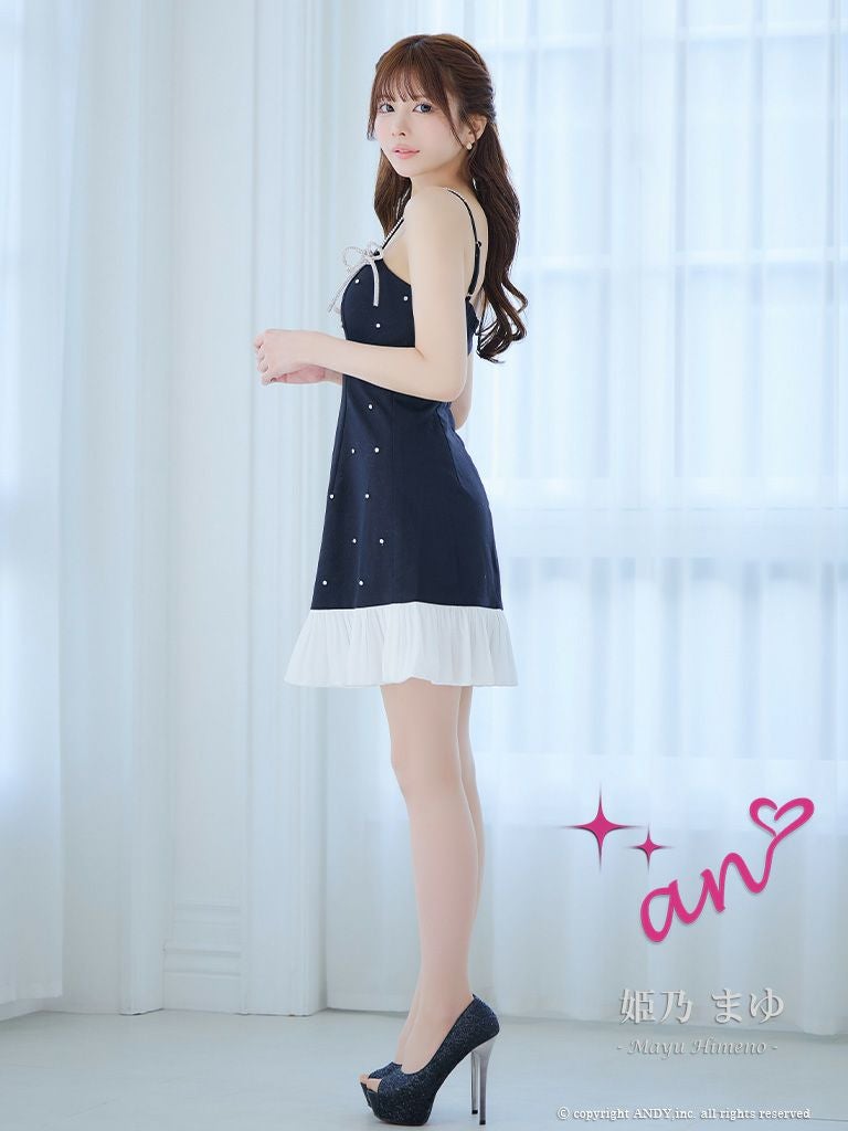 リボンとパールが女性らしいドレススタイルに導く★ [an/アン] 高級 キャミソール ビジュー フリル リボン バストシースルー フレアミニドレス