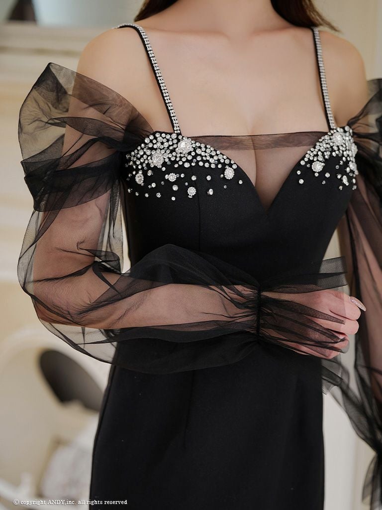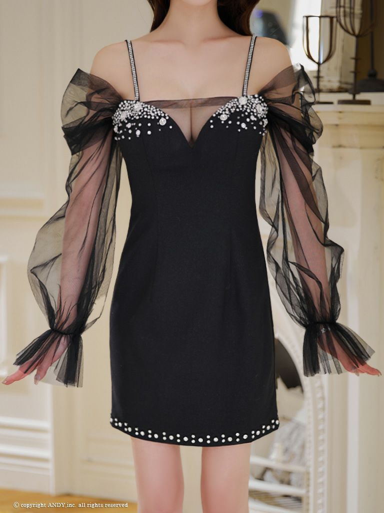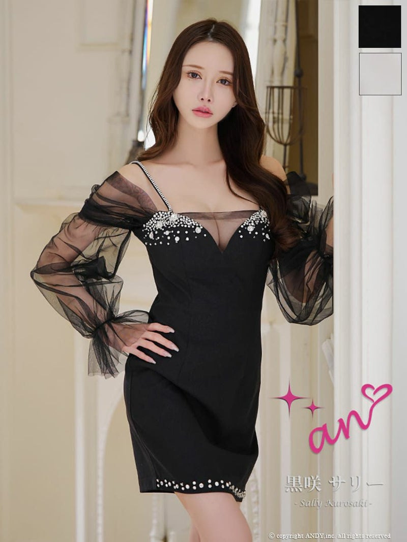 キャバドレス an アンキャミソール ビジュー バストシースルー 長袖 谷間魅せ タイトミニドレス