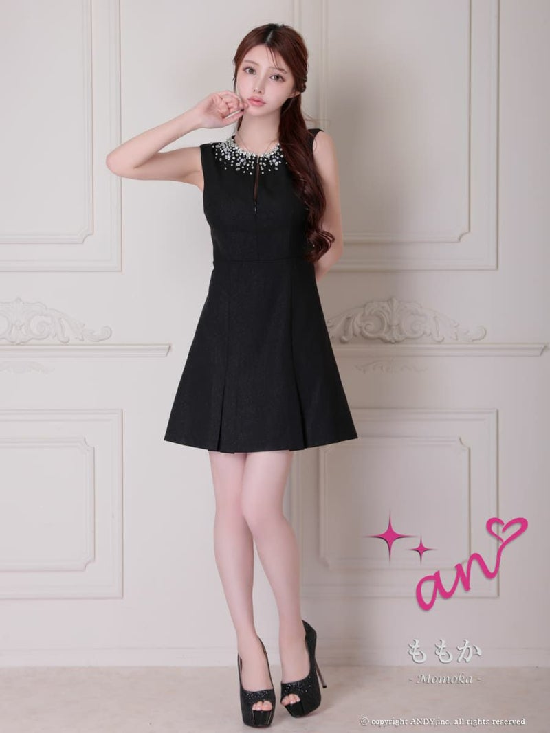 ワンカラーにビジューが映える★ [an/アン] 高級 ノースリーブ ビジュー 背中魅せ ボックスプリーツ フレアミニドレス