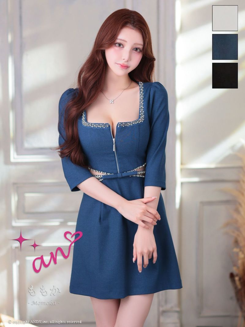 3. [an/アン] 高級 袖あり ジップ くびれ ビジュー フレア ミニ キャバドレス