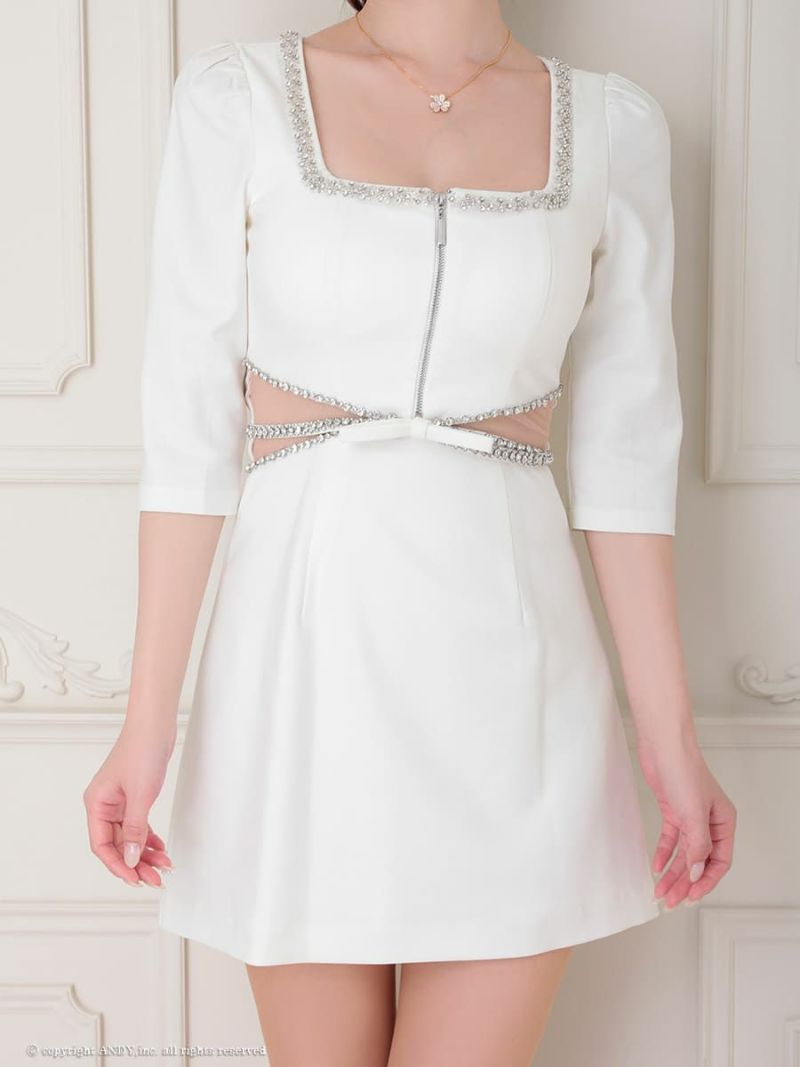 くびれの空き具合がセクシー♡ [an/アン] 高級 袖あり ジップ くびれ ビジュー フレア ミニ キャバドレス